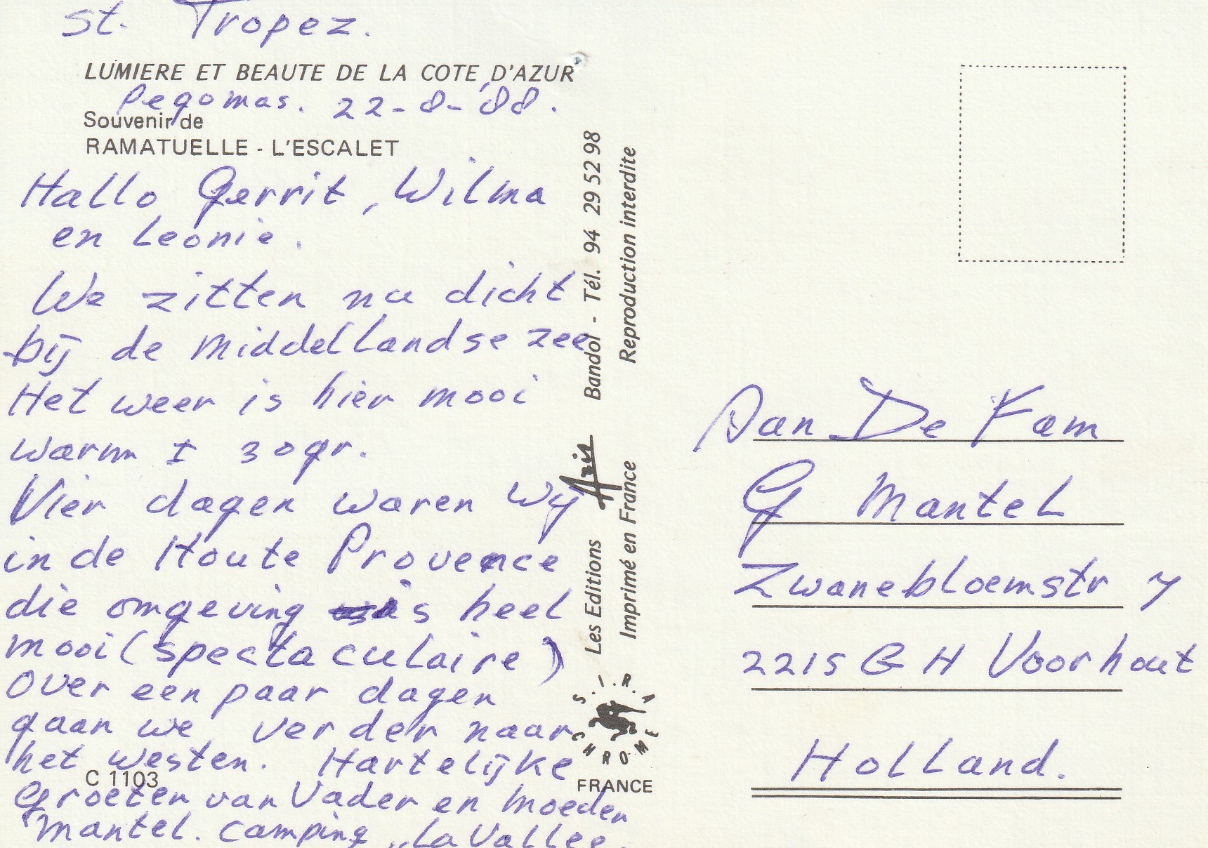 | Aan: | G. Mantel, Zwanebloemstraat, Voorhout |