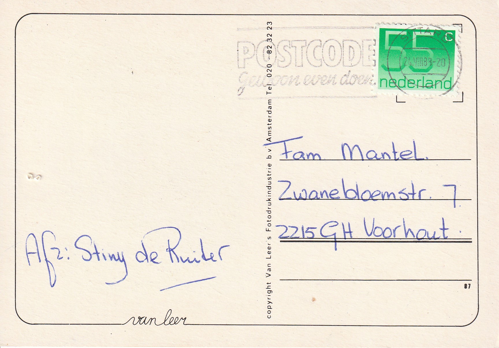 | Aan: | G. Mantel, Zwanebloemstraat, Voorhout |